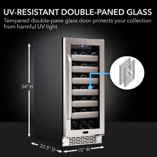 Store your finest bottles of wine in the stylish and functional Whynter Elite Seamless Stainless Steel Door Dual Zone Built-in Wine Refrigerators. Keep your red, white, or sparkling wines at their optimum temperatures using this wine refrigerator’s single zone operation and wide temperature range of 40°- 65°F. The Whynter BWR-331SL wine refrigerator can store approximately 33 standard wine bottles and equipped with an adjustable touch control thermostat and a digital temperature display. Using premium materials and techniques to achieve a seamless door frame, this wine storage unit sets its appearance apart from your conventional product.