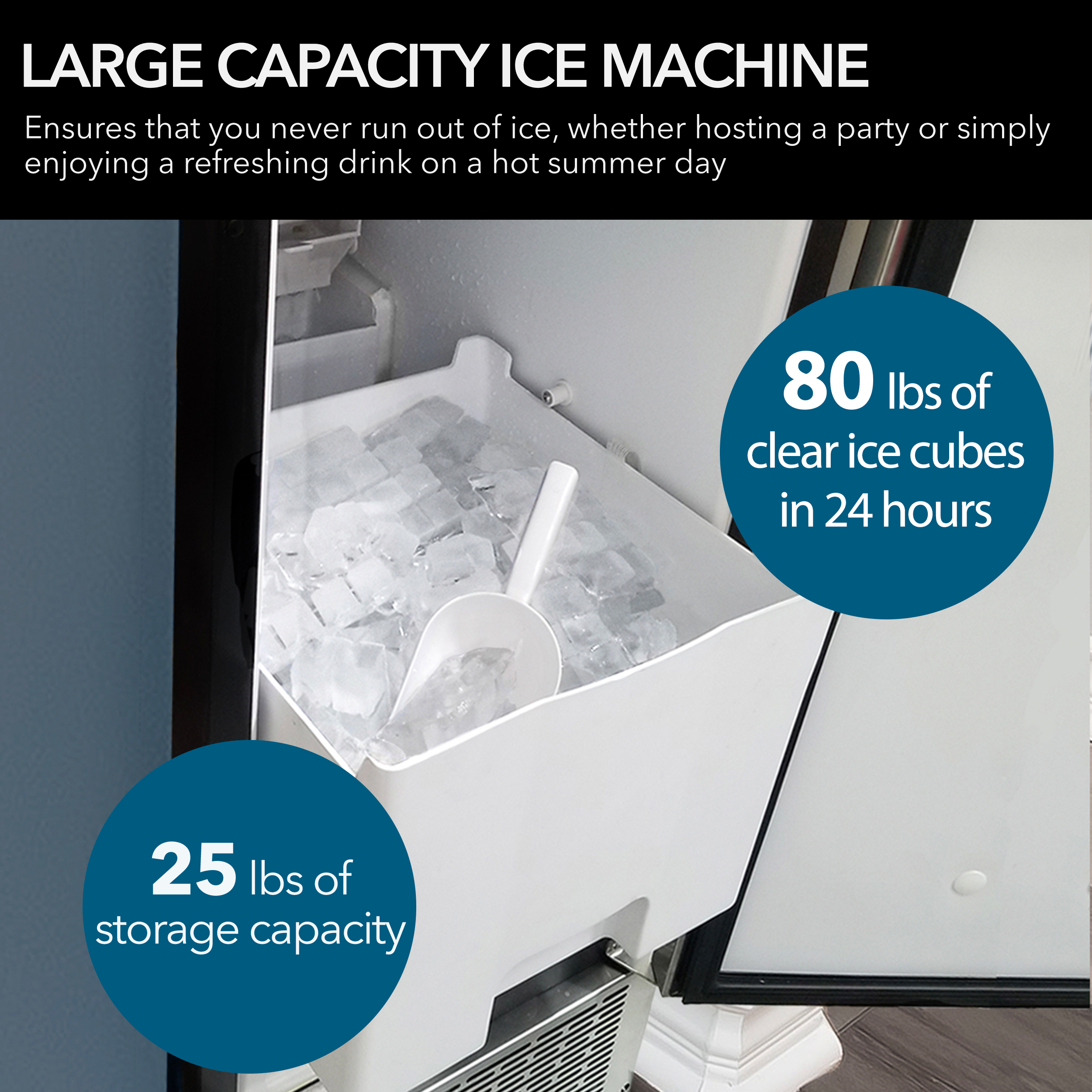 The Whynter UIM-502SS / UIM-502SSa Stainless Steel Built-In Ice Maker complements any modern kitchen and bar area making 80 lbs of clear ice cubes in 24 hours and can store 25 lbs of ice. The stainless steel housing also ensures that you won’t get any smudges or prints on the ice maker, all the while keeping the unit safe from normal wear and tear.