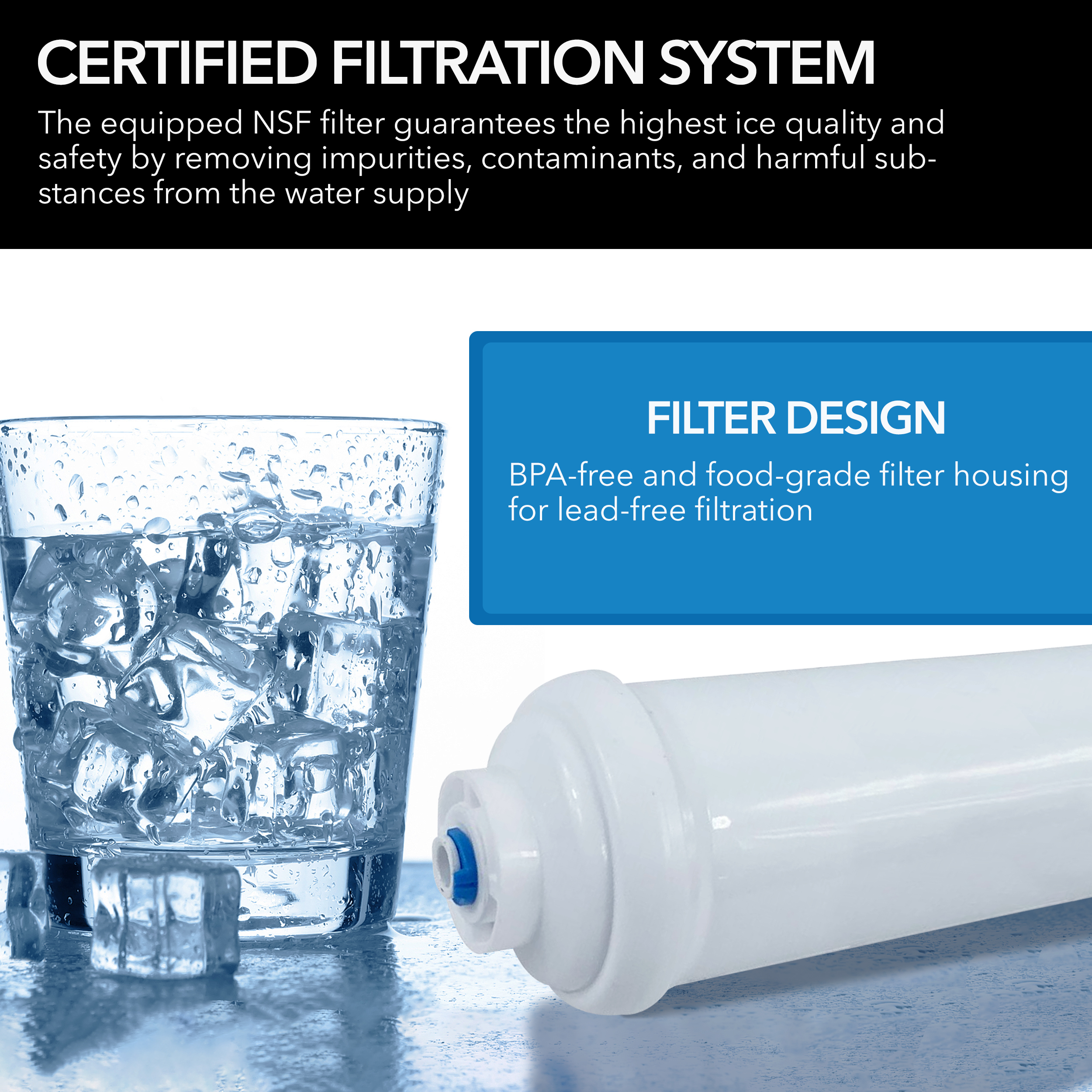 This Whynter UIM-502SS comes with an inline water filter that is certified to NSF standards. With the NSF certification mark, this means that this water filter has been tested for safety to help protect you and your family. This filter ensures that it can remove chlorine and will not leach contaminants into your drinking water.