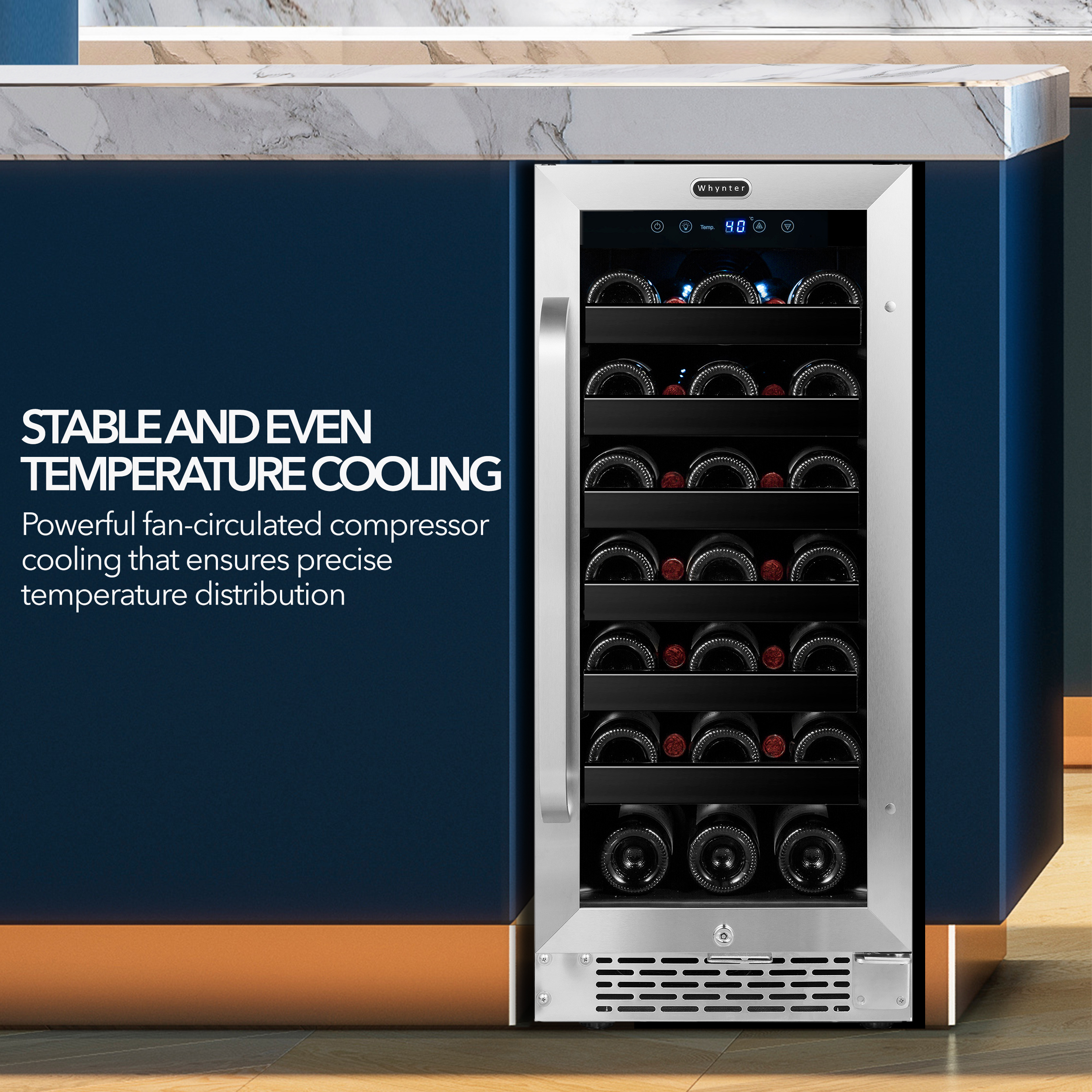 Our Whynter Built-In Under-Counter Stainless Steel Wine Refrigerator offers premium quality and innovative design ideal for your wine collecting needs. Whether for the enthusiast or the connoisseur, this single zone compressor wine refrigerator provides premium and advanced wine storage functionality. The Whynter BWR-308SB can hold up to 33 standard 750ml wine bottles.