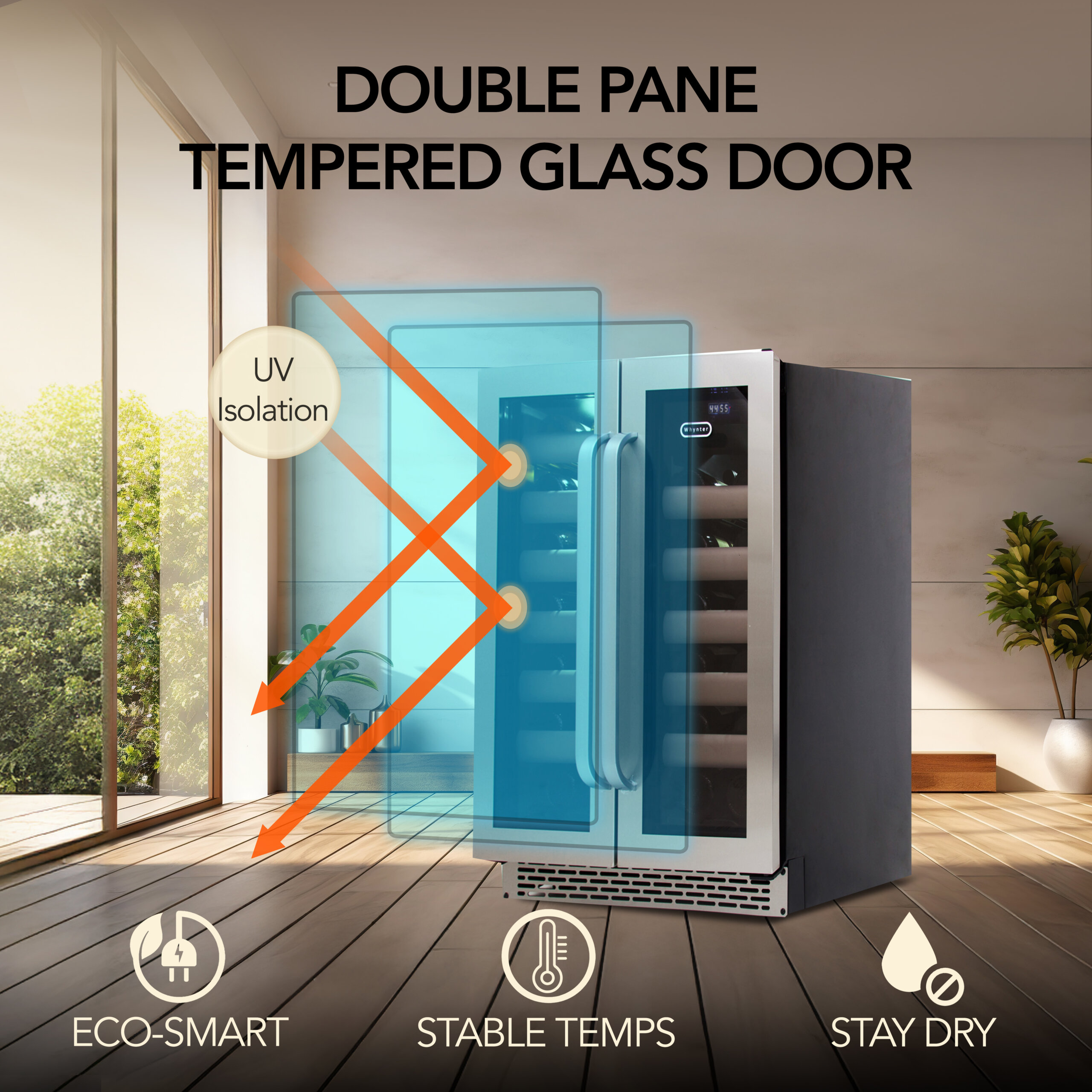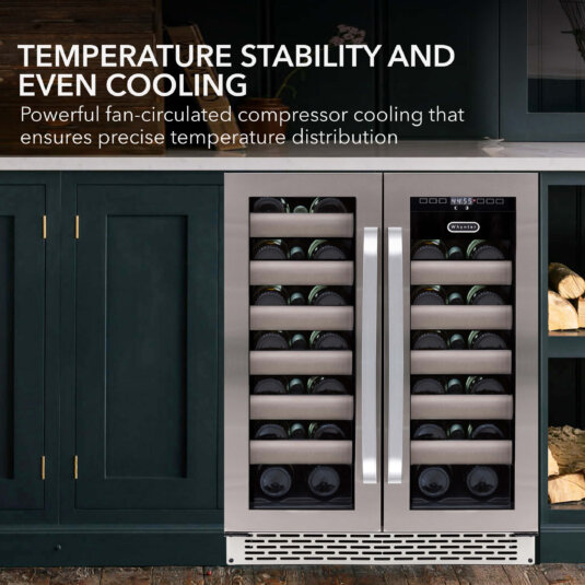 Store your finest bottles of wine in the stylish and functional Whynter Elite Seamless Stainless Steel Door Dual Zone Built-in Wine Refrigerators. Keep both red and white wines at their optimum temperatures using this wine refrigerator’s dual zone operation and wide temperature range of 40°- 65°F. The Whynter BWR-401DS wine refrigerator can store approximately 20 bottles in the left zone and 20 in the right zone, each adjustable using the touch controls and a digital temperature display. Using premium materials and techniques to achieve a seamless door frame, this wine storage unit sets its appearance apart from your conventional product.