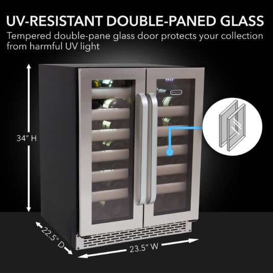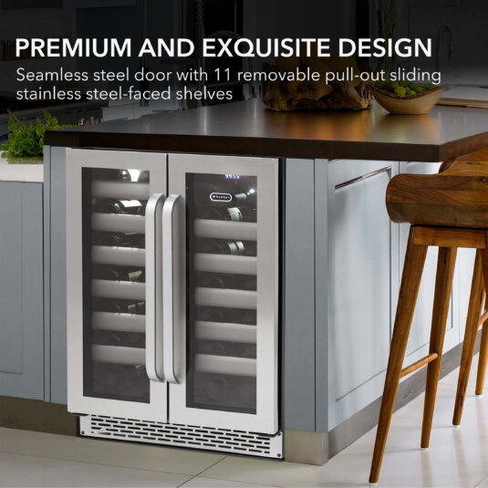 With an all-black cabinet, seamless stainless steel double-paned glass french door, and sliding shelves, this wine refrigerator is as alluring as it is dependable. The seamless glass door and soft interior lighting turn your wine collection into a breathtaking display. With its front ventilation design, this unit is intended for built-in installation or simply as a free-standing unit.