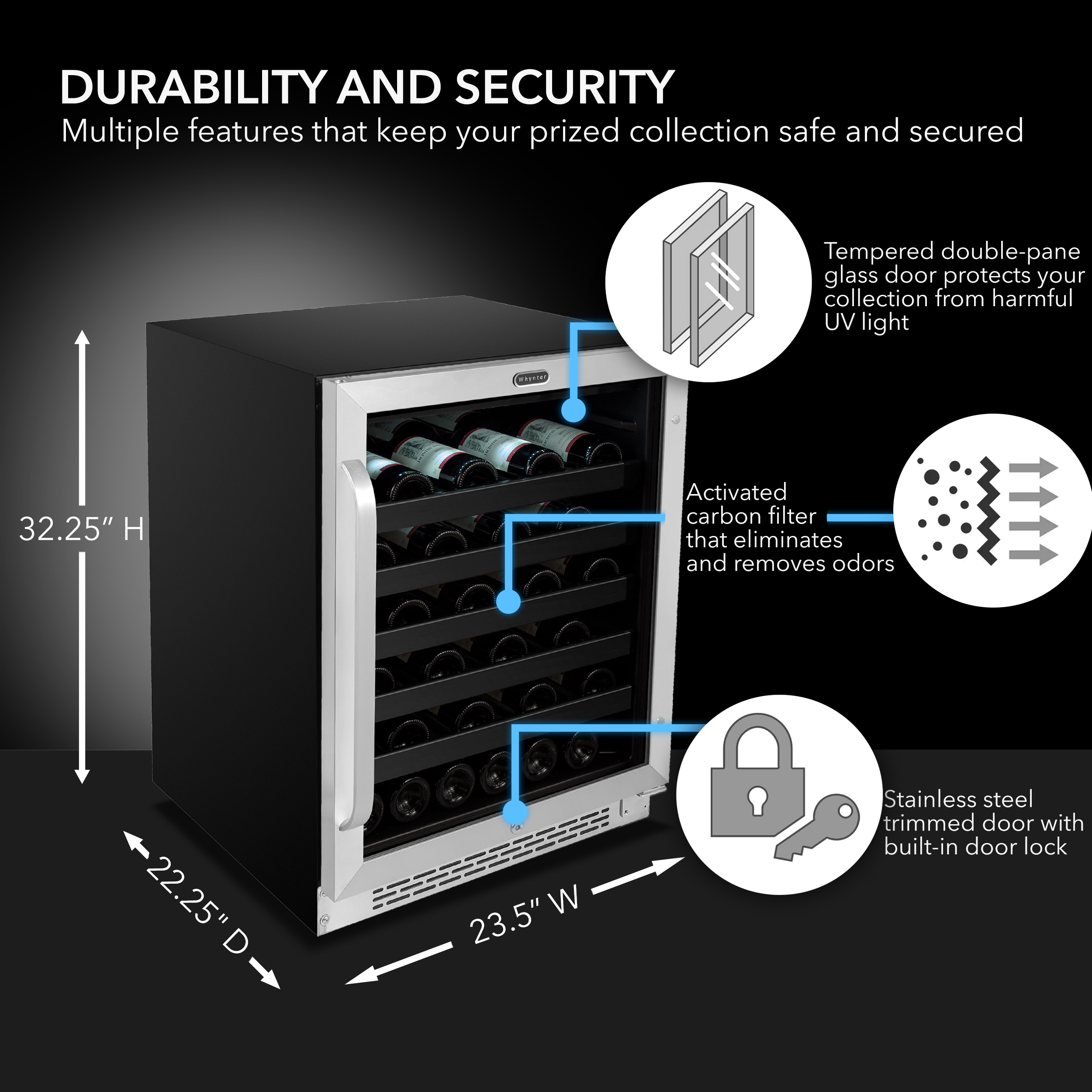 Our Whynter Built-In Under-Counter Stainless Steel Wine Refrigerator offers premium quality and innovative design ideal for your wine collecting needs. This single zone compressor wine refrigerator provides premium and advanced wine storage functionality for any enthusiast or connoisseur. The Whynter BWR-408SB can hold up to 46 standard 750ml wine bottles.