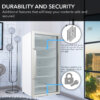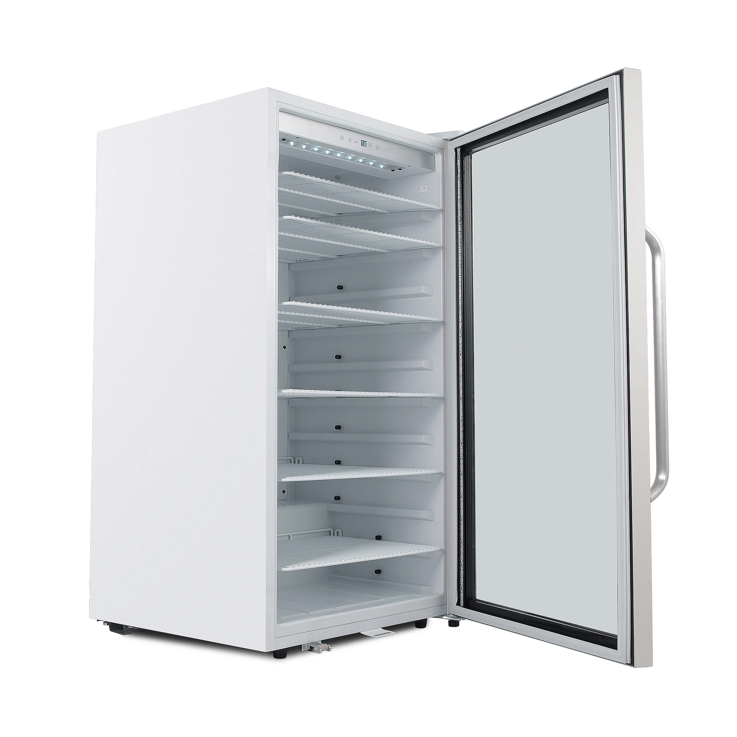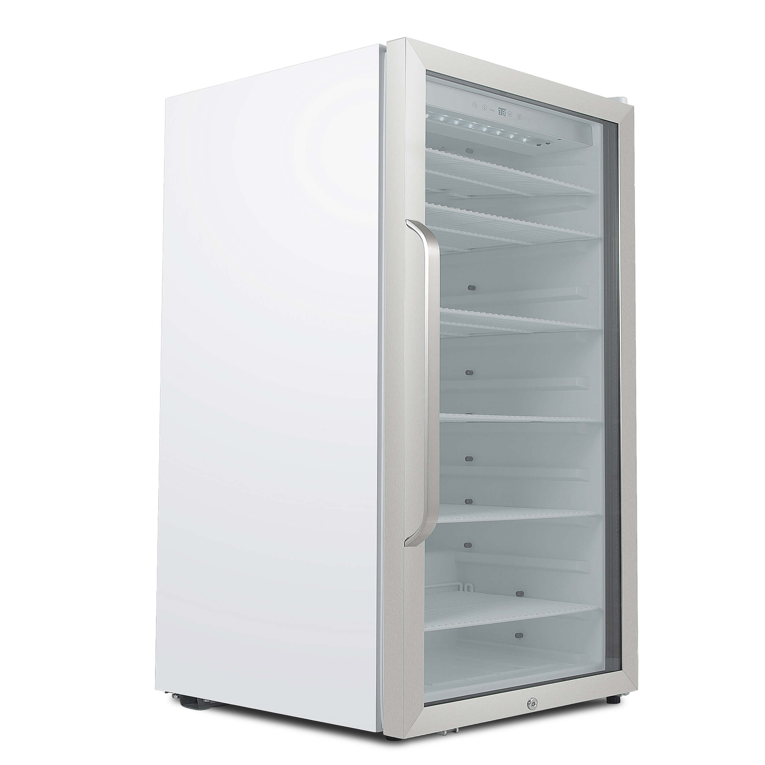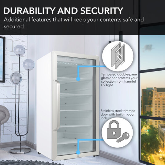 Our mini fridge with glass door and LED lights offers premium design and quality. You and your guests will appreciate the stainless steel trimmed glass door, luxurious curved handlebar, and sleek white cabinet. The tempered double-pane glass offers UV protection and lets you easily check your drink inventory. In addition, soft interior LED lighting can be set at the flip of a switch.