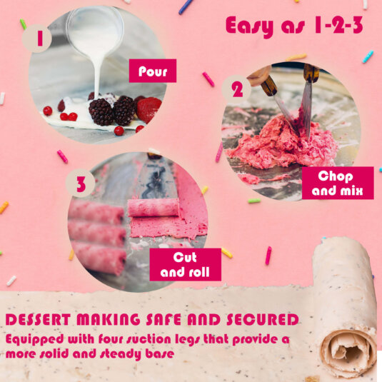 Rolled ice cream, also known as stir-fried ice cream, is made by stirring ingredients on an ice pan and simultaneously cooling to approximately 14°F. Rolled ice cream is chopped and scrapped while being frozen in an ice pan. This reduces the amount of air trapped inside ice cream making it taste more intense.