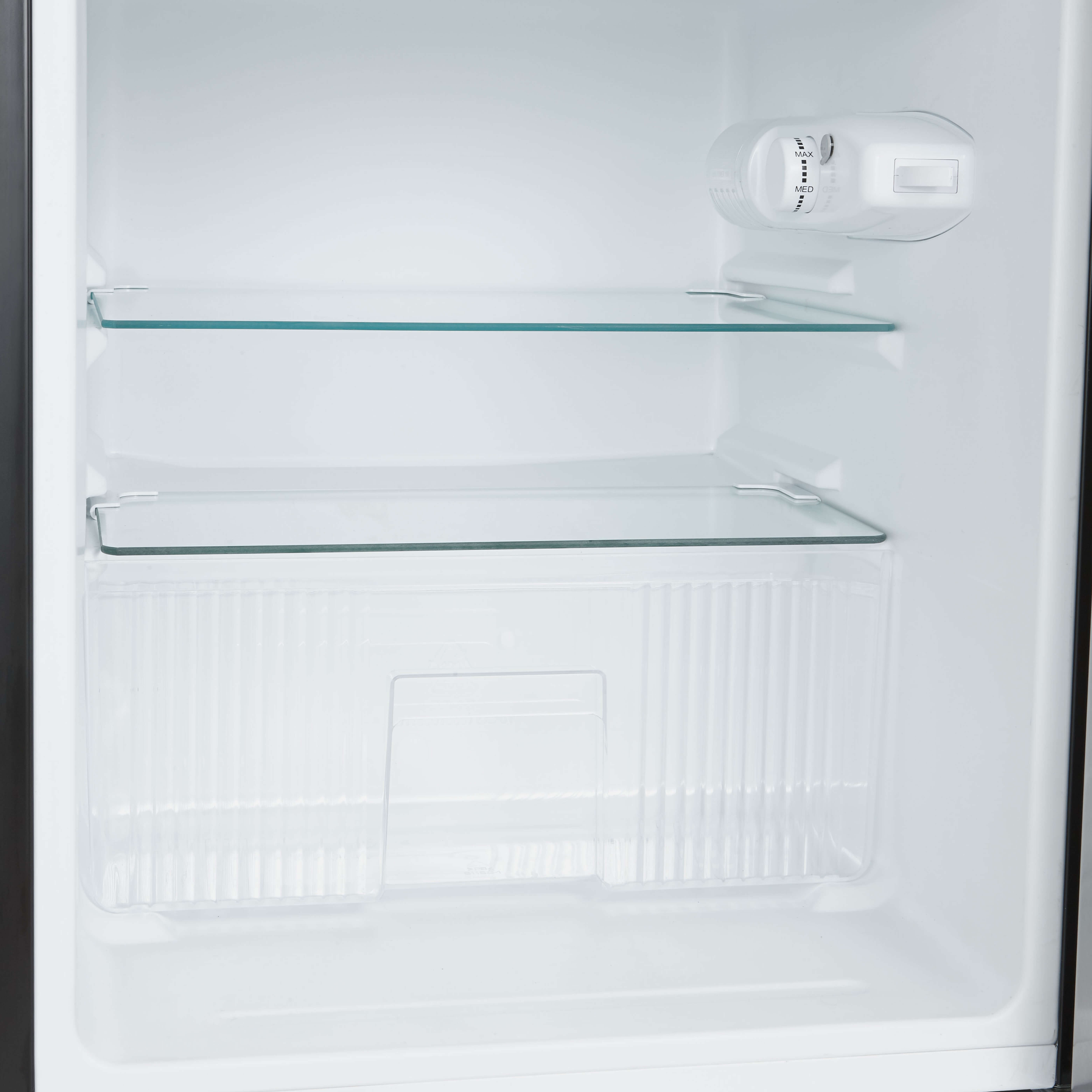 The two glass shelves can be adjusted for maximum storage flexibility.