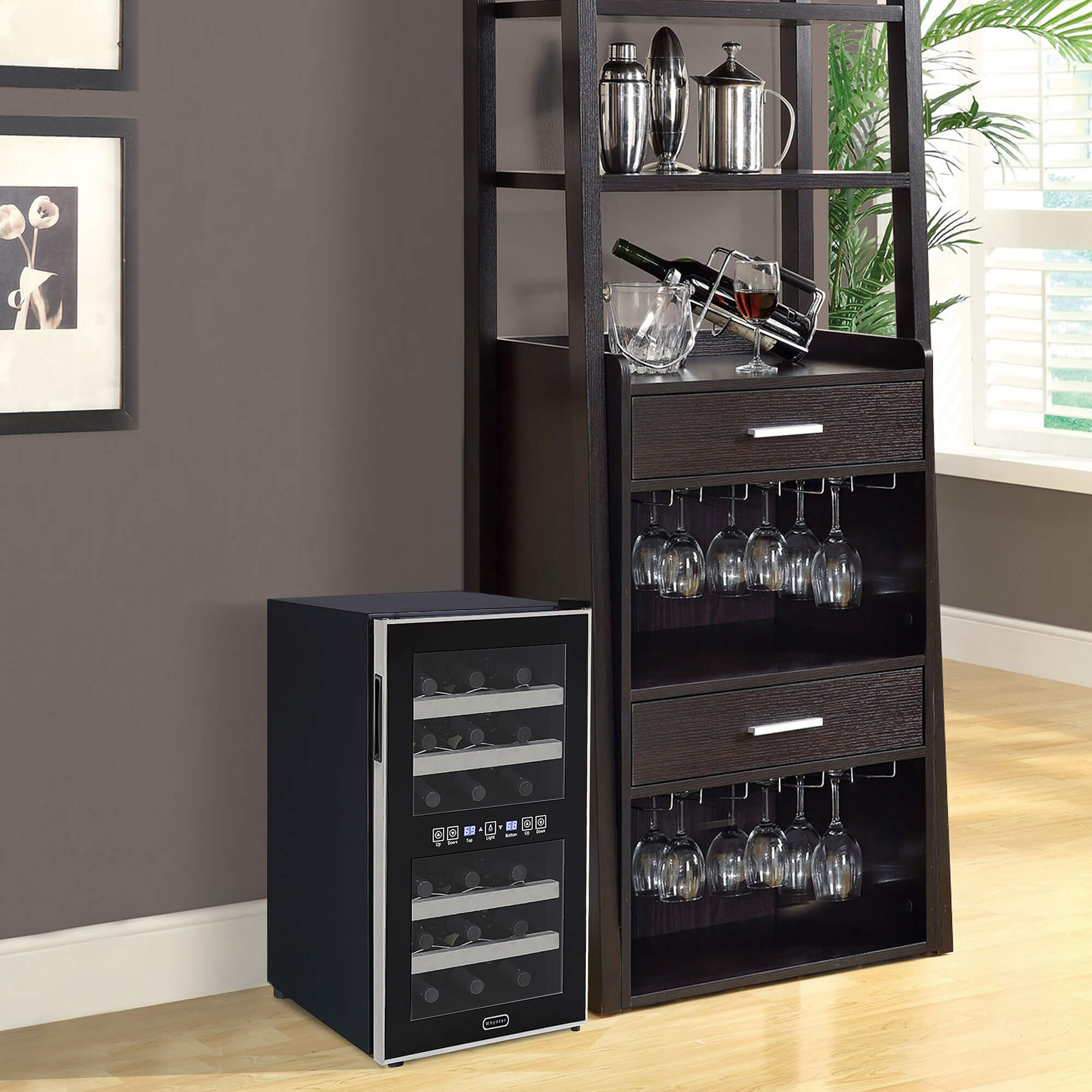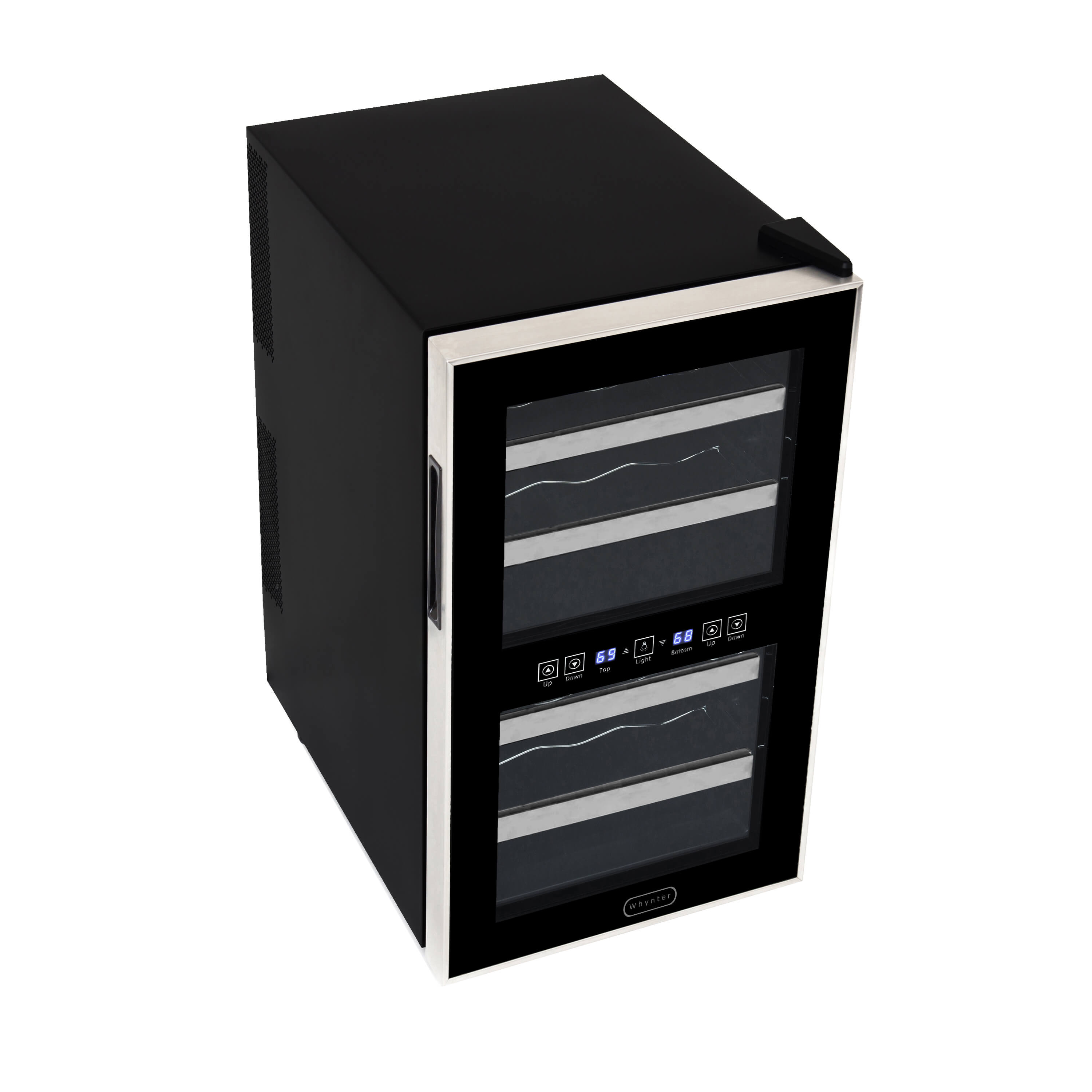 The Whynter WC-181DA 18 Bottle Dual Zone Touch Control Stainless Trim Wine Cooler is an outstanding wine storage solution for any small space. This compact wine cooler can securely accommodate up to 18 of your best 750ml wine bottles. It is equipped with dual-temperature zones to appropriately store both your reds and whites. The Whynter WC-181DA Wine Cooler is the perfect addition to any area with its interior light display, sleek black cabinet, and stainless steel trim dual-pane glass door.