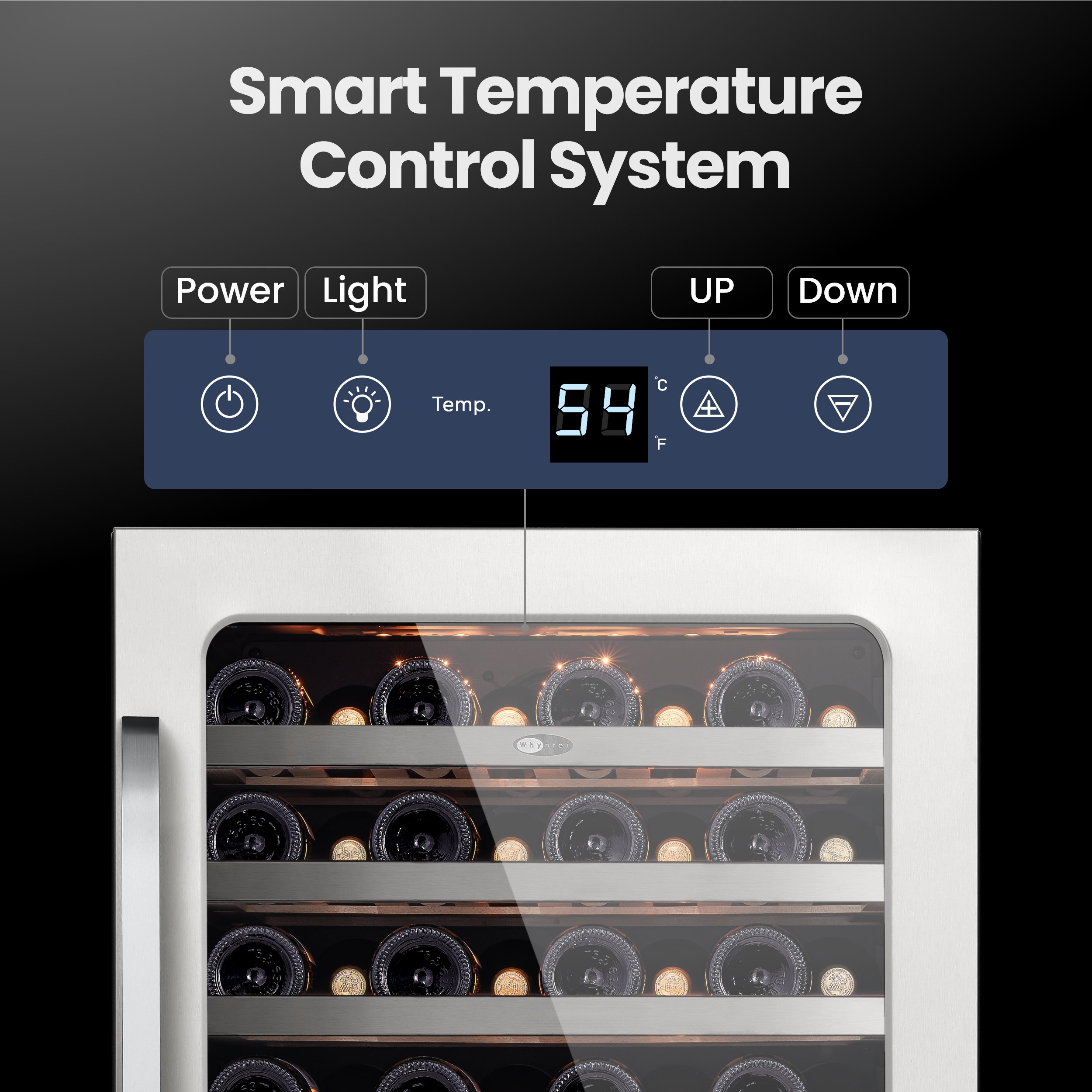 Temperature adjustment (40-65 °F) with ±1 °F accuracy.