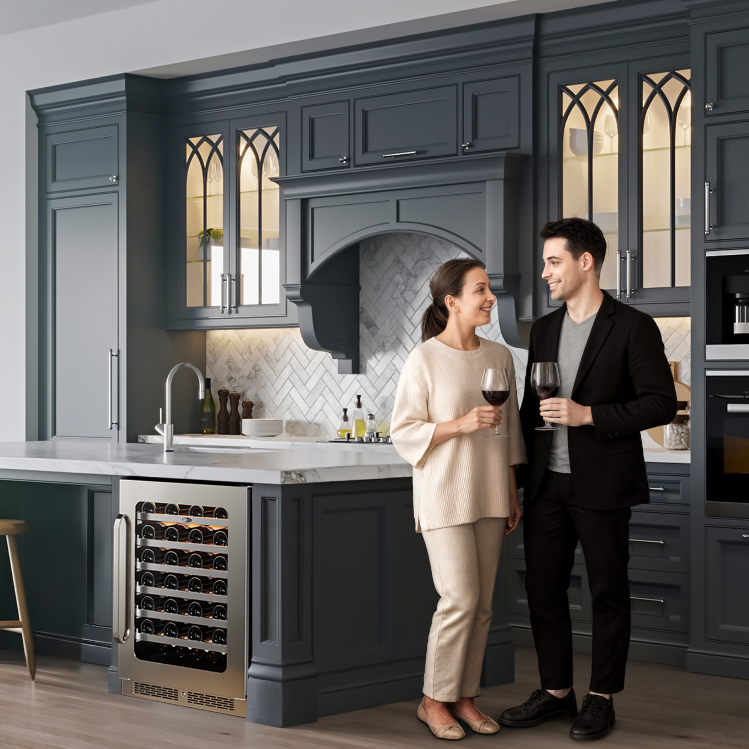 Whynter 24-inch Wine Fridge holds 54 bottles with precise 40-65 °F temperature control. Advanced internal fan-forced circulation ensures uniform temperature distribution in the cabinet. Premium dual-pane anti-UV glass door protects wines from light damage. Elegant curved handles for sophisticated access. Adjustable beechwood shelves allow flexible storage.