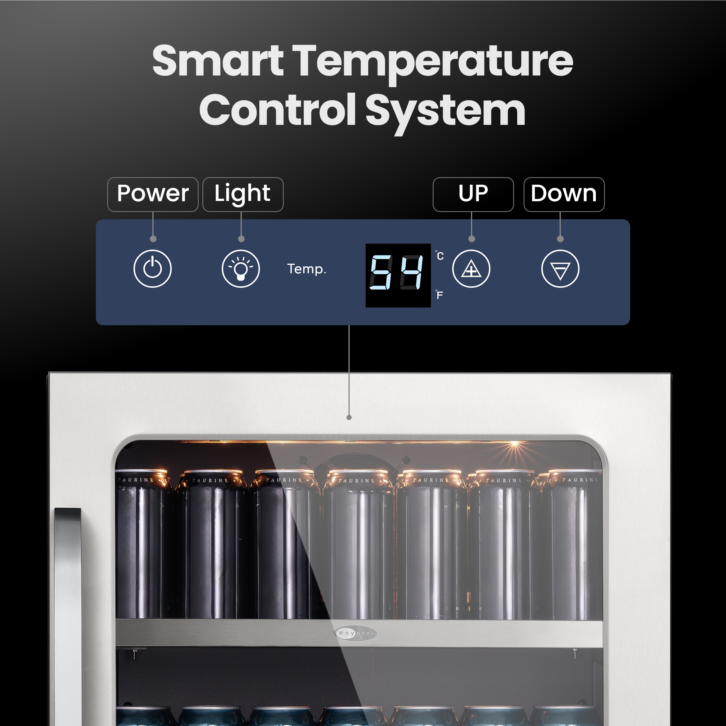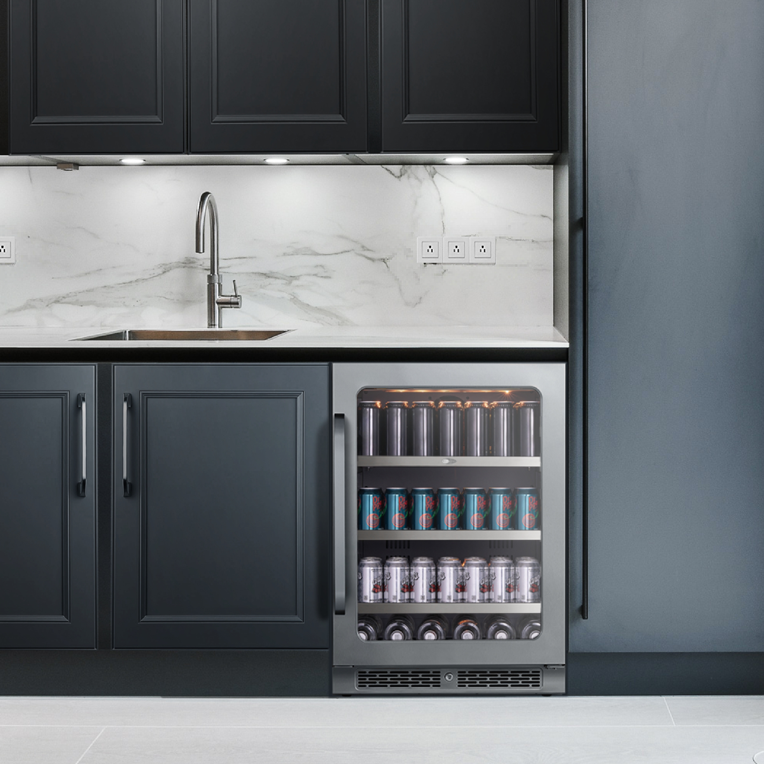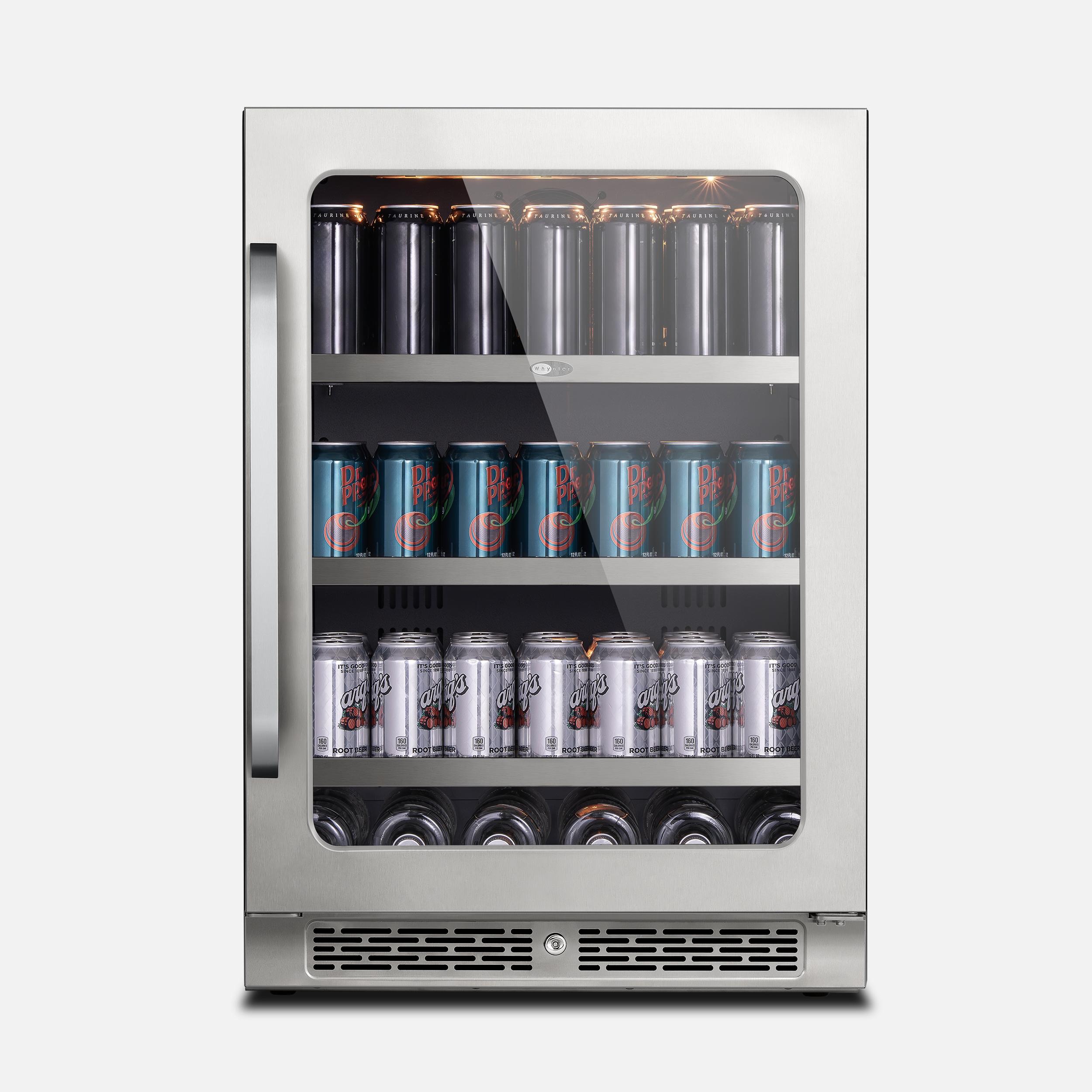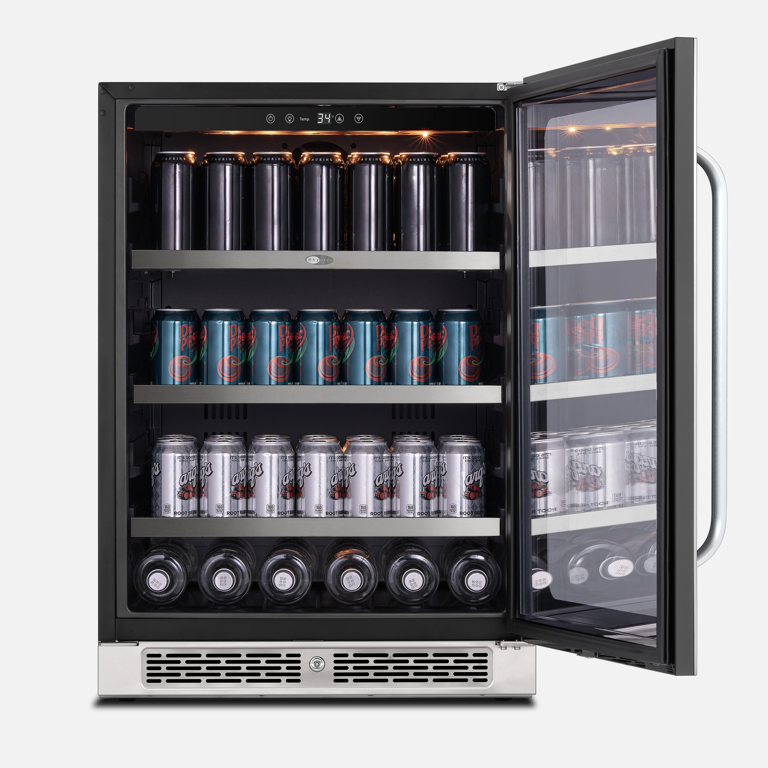 Whynter 24-inch Beverage Refrigerator holds 140 cans with precise 34-54°F temperature control. Advanced internal fan-forced circulation ensures uniform temperature distribution in the cabinet. Features a fingerprint-resistant stainless steel and dual-pane anti-UV glass door to protect drinks from light damage. Adjustable tempered glass shelves allow flexible storage.