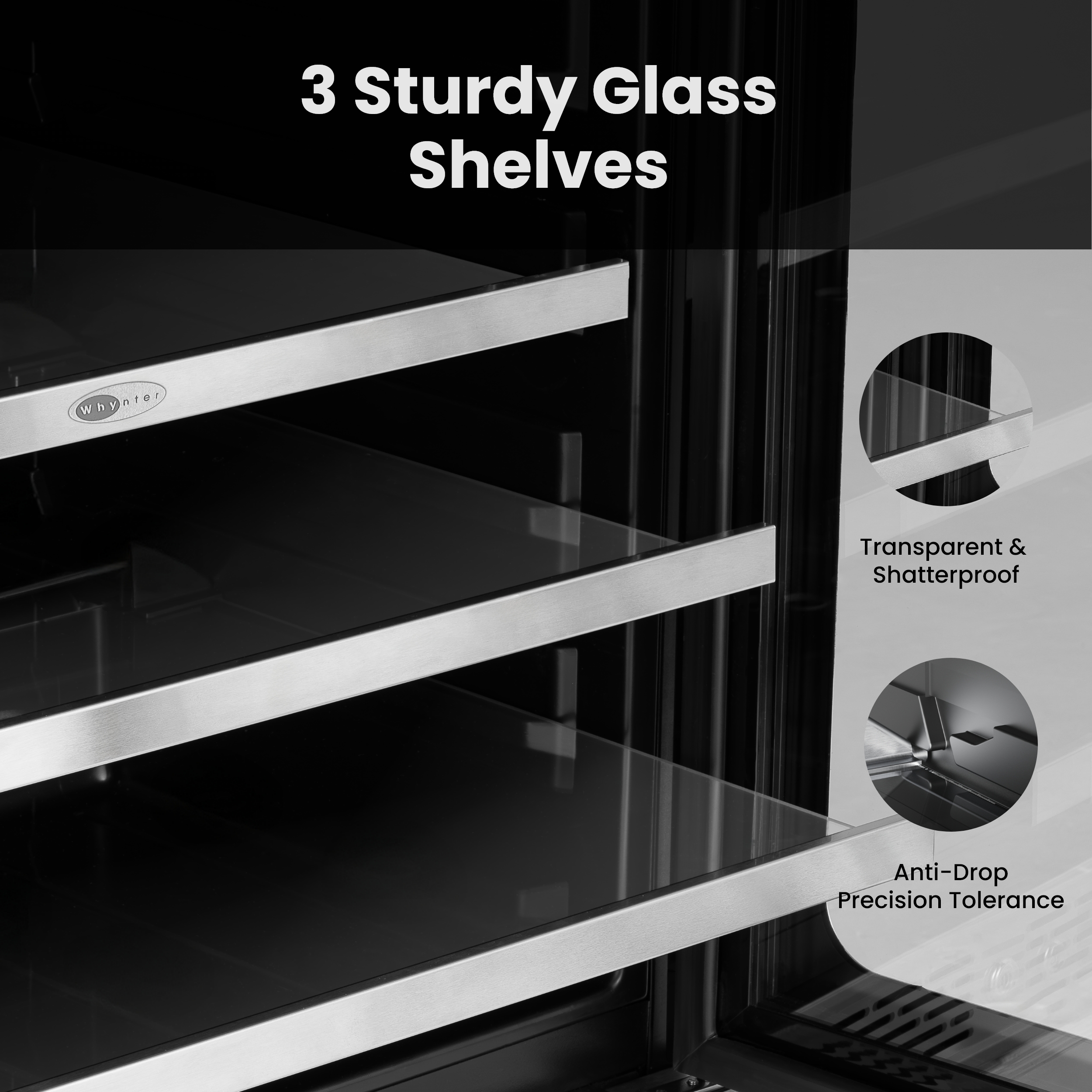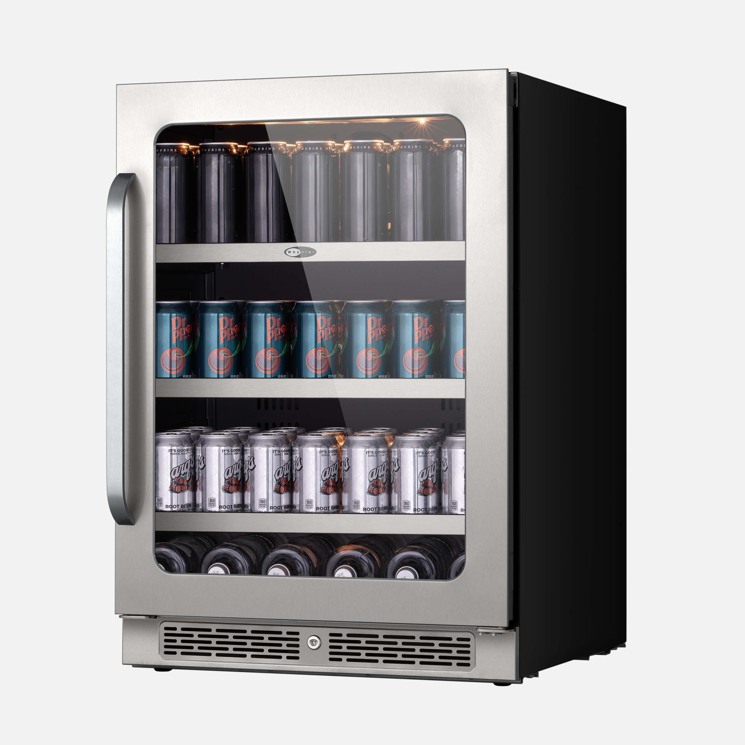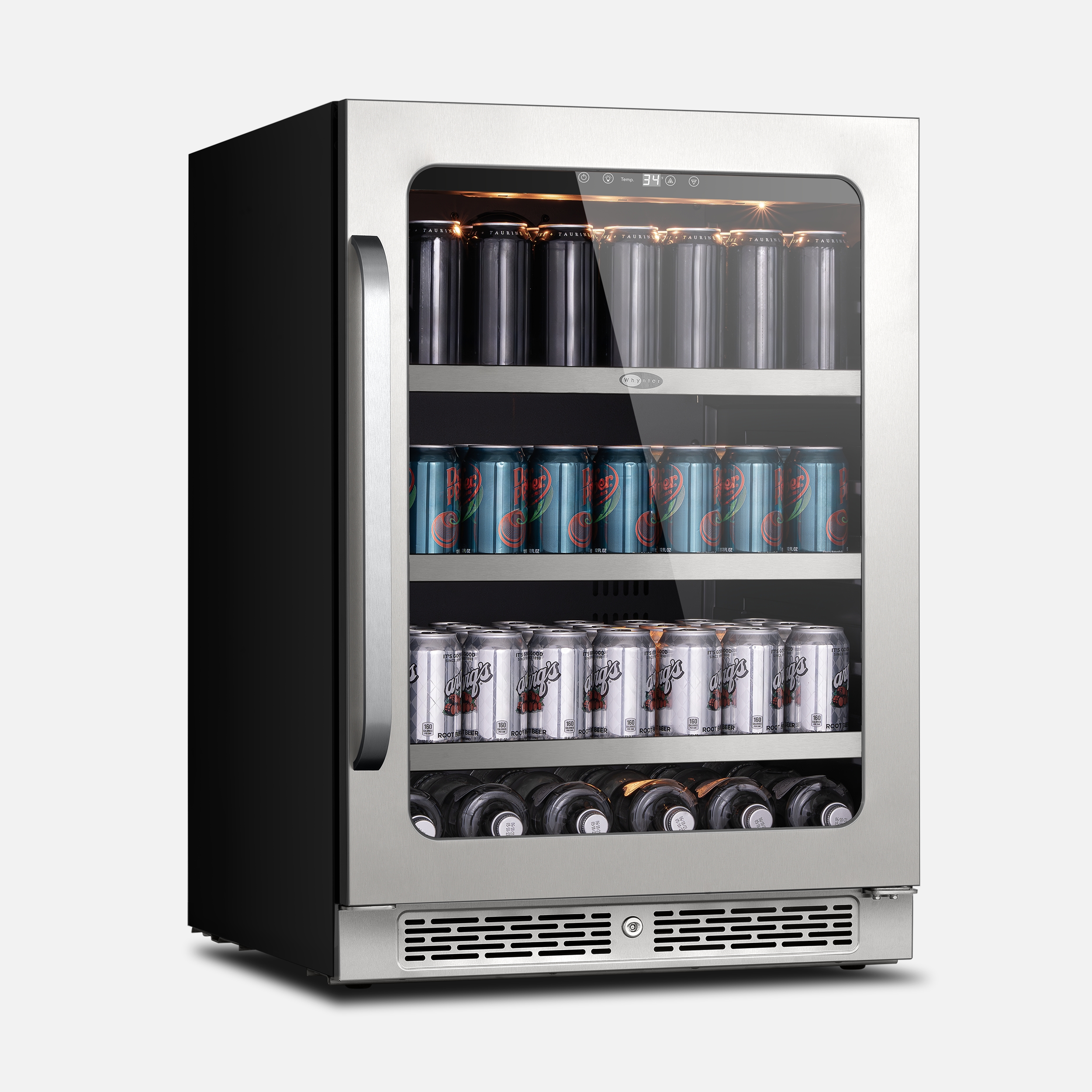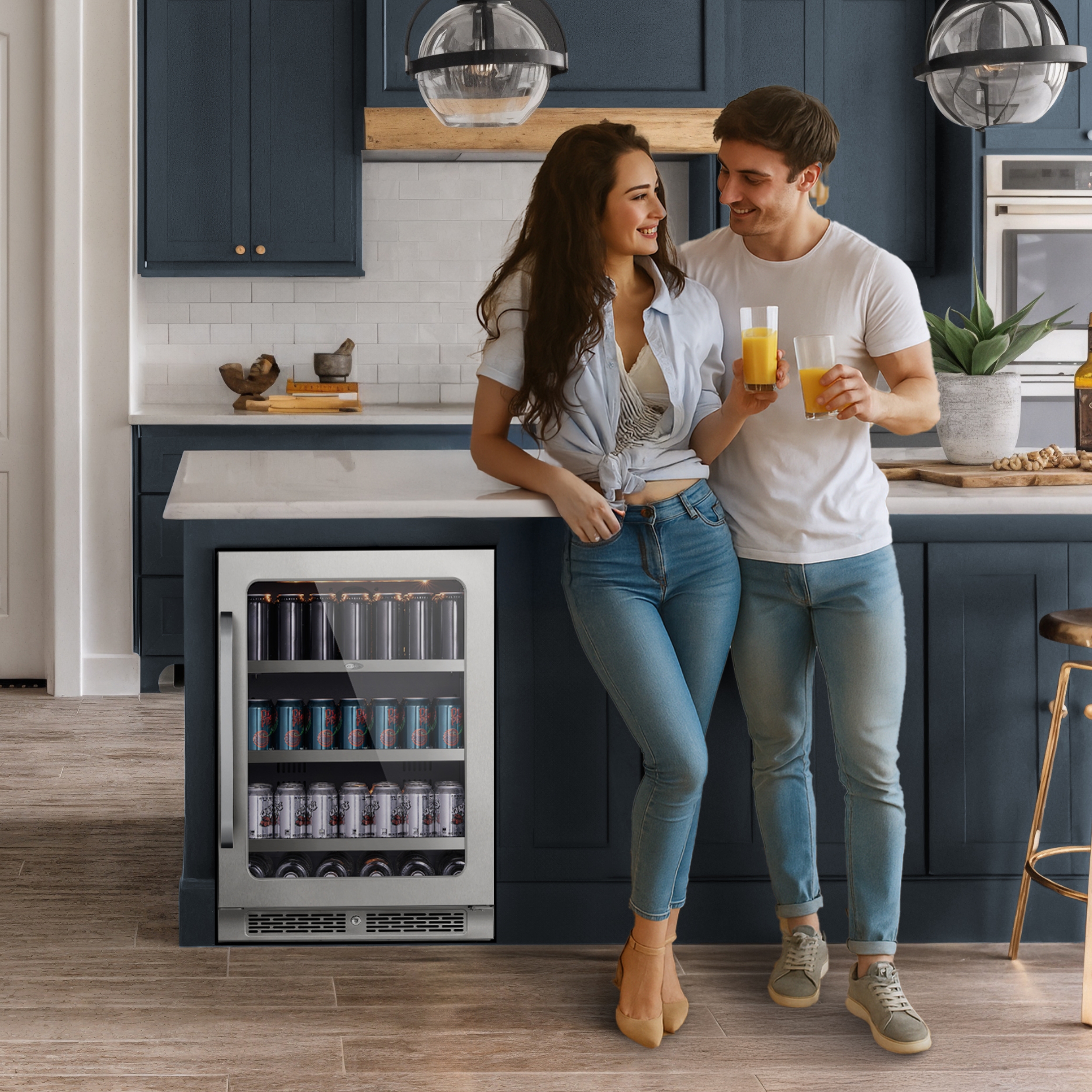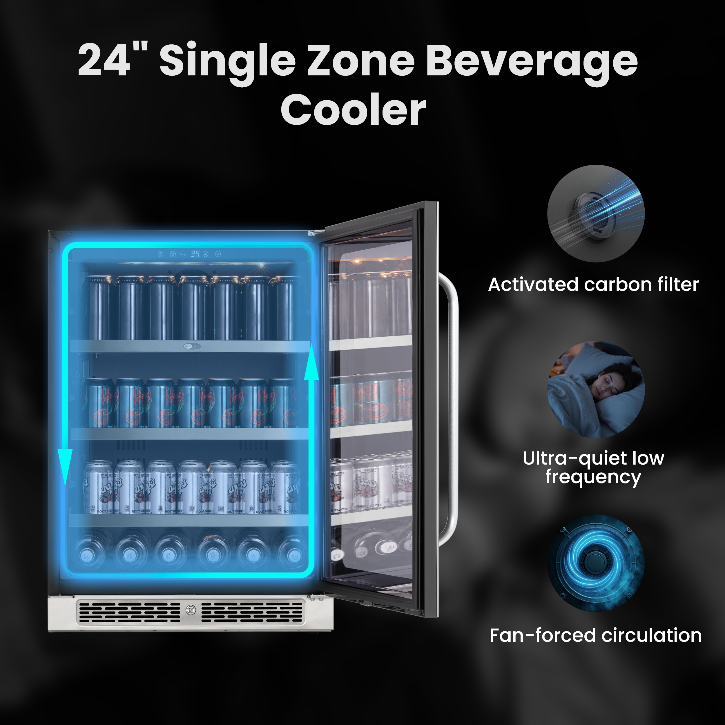 Whynter 24-inch Beverage Refrigerator holds 140 cans with precise 34-54°F temperature control. Advanced internal fan-forced circulation ensures uniform temperature distribution in the cabinet. Features a fingerprint-resistant stainless steel and dual-pane anti-UV glass door to protect drinks from light damage. Adjustable tempered glass shelves allow flexible storage.